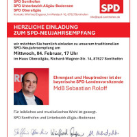 Am Mittwoch, 4.2., um 17 Uhr findet der alljährliche Neujahrsempfang der SPD statt. Hauptredner in diesem Jahr ist der Landesvorsitzende: MdB Sebastian Roloff. Auf Einladung des SPD Unterbezirks Allgäu-Bodensee, des Kreisverbands Oberallgäu und des Ortsvereins Sonthofen werden sich auch die Kandidaten für das Amt des Landrats, Matthias Schemann, und des Bürgermeisters in Sonthofen, Mathias Zuchtriegel, vorstellen. Roloff ist seit 2020 für den Wahlkreis München-Süd Mitglied des Bundestags. Der 43-jährige Rechtsanwalt engagiert sich besonders im Bereich Wirtschaft und Energie, sowie die Queerpolitik. Grundlage seines politischen Handelns war stets das Streben nach Gerechtigkeit und Solidarität mit den Benachteiligten. Seit 2025 steht Sebastian Roloff gemeinsam mit Ronja Endres an der Spitze der Bayern-SPD.